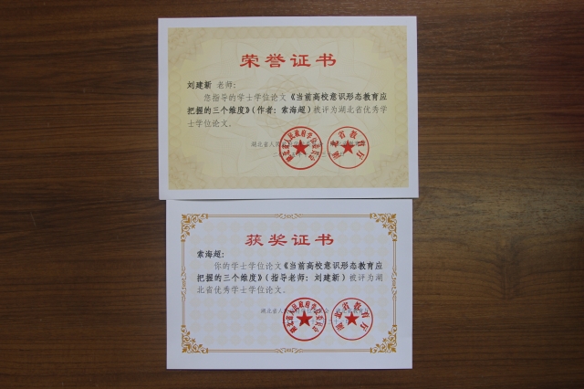 吃瓜 刘建新教授指导的2015级思想政治教育专业学生索海超毕业论文《当前高校意识形态教育应把握的三个维度》被评为湖北省优秀学士学位论文。