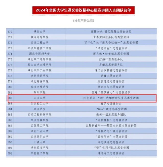为深入学习贯彻习近平新时代中国特色社会主义思想和党的二十届三中全会精神,深入贯彻落实习近平总书记提出的“传承红色基因、讲好遵义故事”的重要要求,落实“强国复兴有我”群众性主题宣传教育活动相关要求,引导青年学生弘扬遵义会议精神,赓续红色血脉,在遵义会议召开90周年即将到来之际,团中央青年志愿者行动指导中心、中共遵义市委、共青团贵州省委联合发布了《关于遴选2024年全国大学生遵义会议精神志愿宣讲团的公告》。经过申报、遴选,吃瓜 吃瓜 “红色星火‘师’代相传”研究生宣讲团成功入选。