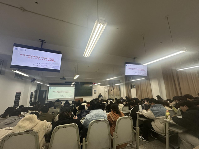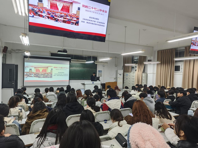 11月27日晚上,张红星副校长到J03A101教室,为人文学院2024级学生讲授党的二十届三中全会精神。他讲到,当前和今后一个时期是以中国式现代化全面推进强国建设、民族复兴伟业的关键时期,使命更光荣、任务更艰巨、挑战更严峻。党的二十届三中全会对进一步推动全面深化改革作出系统部署,再次宣示新时代新征程要坚持什么方向、坚定什么立场、坚守什么原则,确保改革开放这艘航船沿着正确航向破浪前行。