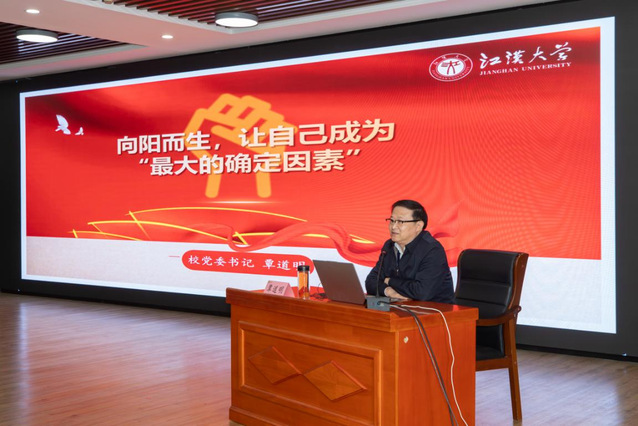 11月28日下午,校党委书记覃道明以“向阳而生,让自己成为‘最大的确定因素’”为题,为2024年“青马工程”团学干部培训班学员及研究生作专题讲课。