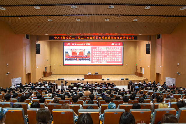 覃道明紧扣宣讲主题,结合高校教育教学实际,围绕学习贯彻习近平总书记在党的二十届三中全会上的重要讲话精神和全会《决定》,从前言、牢牢把握全会精神的总纲、牢牢把握进一步全面深化改革的总要求、牢牢把握进一步全面深化改革的总部署和结语等5个部分对党的二十届三中全会精神进行了系统阐述和深入解读。报告主题鲜明、内容丰富,深入浅出、生动鲜活,师生们对党的二十届三中全会精神有了更加深刻的理解。