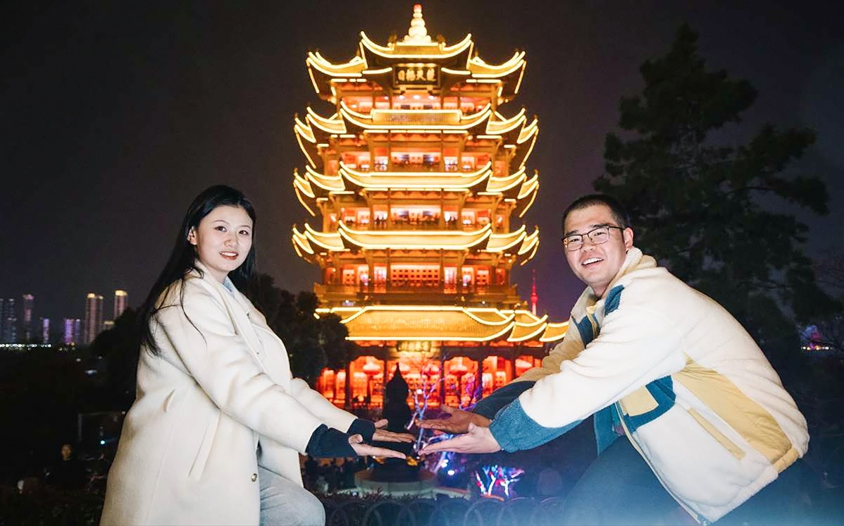 北京大学外国语学院2022级俄罗斯语言文学专业本科生王皓一在长江大桥上和黄鹤楼同框打卡。陈浩然 摄