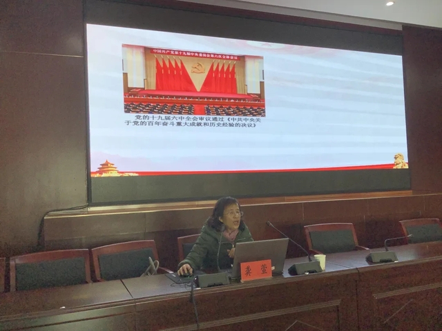 教授龚萱,在街机关四楼会议室开展党的十九届六中全会精神宣讲。街党政领导,机关各科室负责人,各社区、大队书记,基层单位、二级站所主要负责人,辖区两新组织代表共计50余人参会学习,街人大工委主任黄养林主持。