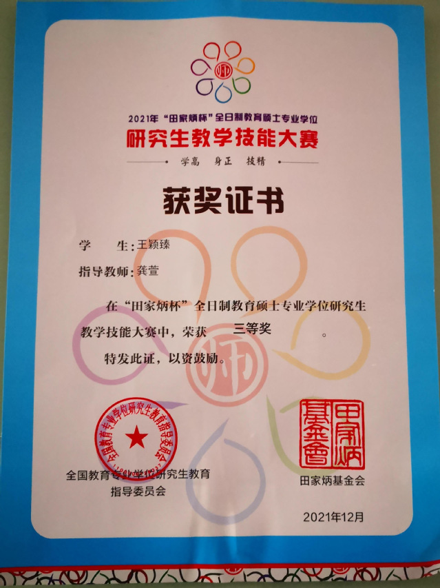 本次大赛由全国教育专业学位研究生教育指导委员会主办,浙江师范大学承办。大赛分为初赛和决赛两个阶段初赛需提供1学时5000字左右的教学设计,包括设计理念、学情分析、教材分析、教学目标、教学环节等,并录制10分钟左右的教学视频。决赛采用线上抽题、线下实施、视频实录、限时提交、在线评审的方式进行。经过初赛和决赛的激烈竞争,王颖臻同学最终获奖。谈及参与比赛的感受王颖臻同学说:这次比赛是非常好的锻炼机会,比赛中的不完美鞭策着自己在今后加倍努力学院研究生工作部)