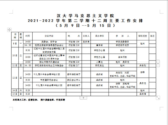 吃瓜 2021-2022-2学期第十二周安排