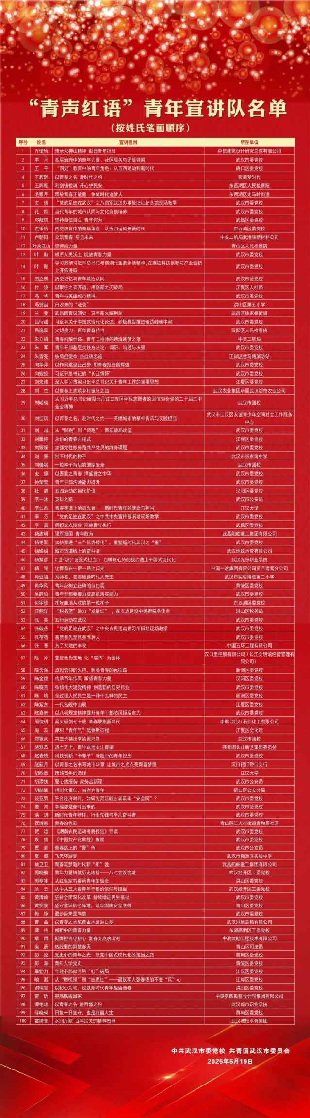 为深入贯彻落实习近平总书记关于青年工作的重要论述,落实省委、市委“干部素质提升年”工作部署,根据《武汉市中长期青年发展规划联席会议2025年为青年办实事项目清单》要求,武汉市委党校联合共青团武汉市委组建“青声红语”青年宣讲队,进机关、进园区、进学校、进社区(乡镇)、进网络开展“青春武汉接力讲”志愿活动。经过各单位推荐、集中培训、集体磨课和试讲评审,最终从全市党校系统和各级团组织中遴选出青年宣讲队员100名。吃瓜 2023级硕士研究生胡欣然同学入选!