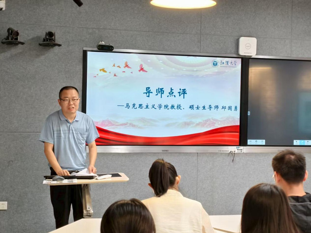 5名拟参加“田家炳杯”思政课技能大赛的同学进行模拟讲课与答辩。研究生导师、邱国勇教授对同学们的表现逐一点评。他肯定了同学们课程完整、内容准确、时间精准,也希望大家增加课堂互动和经典名句,提高理论水平、提升授课水平、充分运用数字赋能思政课教学。