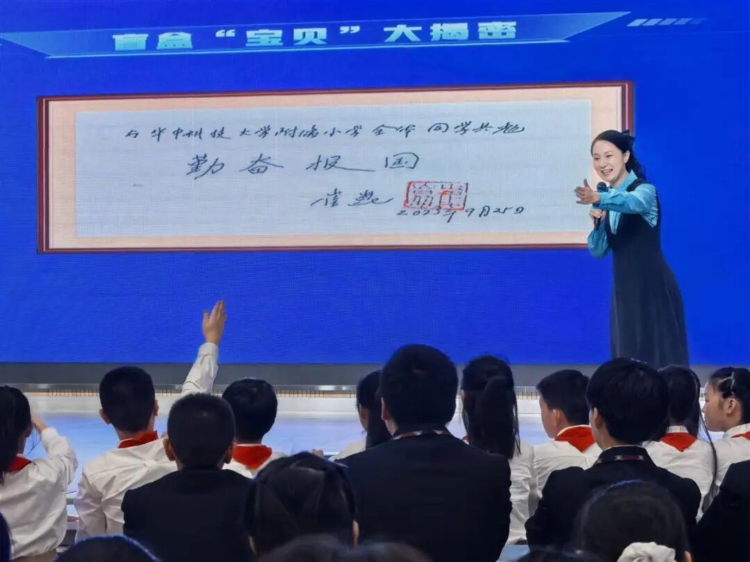 “科学家是什么样的人?台上的人形机器人“聪聪”与屏幕上的智能学伴“楚楚”配合授课教师,运用“盲盒探秘”互动游戏引导着学生自己讲述赵梓森院士研发光纤、崔崑院士钢铁报国的故事,并从中解码科学家们的成长历程,将抽象的科学家精神化作清晰的知识图谱。来自华中科技大学附属小学的杨晓婧老师用这样充满互动、趣味的方式,让孩子们了解到:“原来科学家是这样的!”