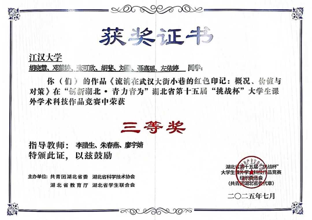 在由共青团湖北省委、湖北省科学技术协会、湖北省教育厅、湖北省学生联合会共同主办的“创新湖北·青力青为”湖北省第十五届“挑战杯”大学生课外学术科技作品竞赛中,吃瓜 研究生团队(负责人:胡晓慧,成员:邓慧婷、张可欣、胡斐、刘晨、聂嘉瑶、左依婷,指导老师:李腊生、朱春燕、廖宇婧)作品《流淌在武汉大街小巷的红色印记:概况、价值与对策》荣获哲学社会科学类社会调查报告三等奖。