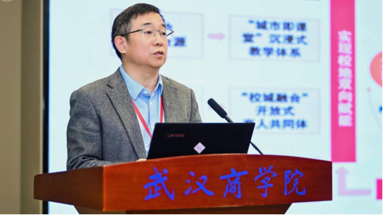 开封职业学院副校长马纪岗作主旨报告。图片来源:武汉商学院