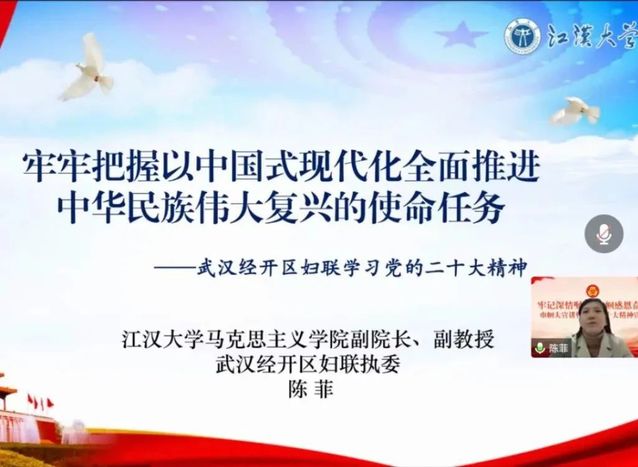 为深入学习贯彻党的二十大精神,12月27日,武汉经开区妇联开展线上“云”宣讲,邀请吃瓜 副院长、区妇联执委陈菲副教授线上为妇联执委、妇联主席、妇联工作人员等30余位妇女同胞开展二十大精神宣讲。