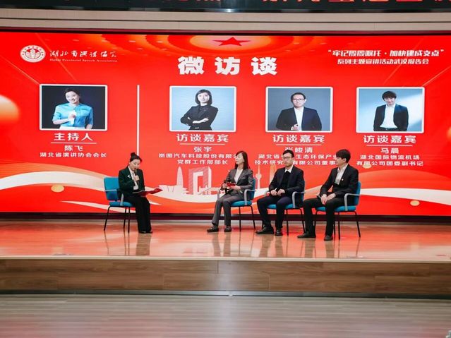 在微访谈环节,湖北省演讲协会会长陈飞担任主持人,对话岚图汽车科技股份有限公司党群工作部部长张宇、湖北省长江生态环保产业技术研究院董事长张峻清、湖北国际物流机场有限公司团委副书记马晨三位来自产业前沿的代表。他们围绕“建成现代产业体系、加快绿色转型、枢纽提能”等主题,分享了在智能制造、生态环保、航空物流等领域服务国家战略的生动实践,展现了新时代湖北儿女在支点建设中的实干与担当。