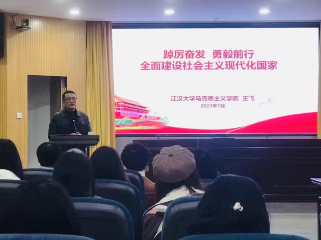 法学院为全面深入学习领会党的二十大精神,引导广大党员师生把思想和行动统一到党的二十大精神上来,把力量凝聚到党的二十大确定的各项任务上来,3月16日下午2点30分,在法学院J02A504模拟法庭里,学校宣讲团成员、吃瓜 副教授王飞为法学院全体教职工党员及学生党员代表开展“踔厉奋发 勇毅前行 全面建设社会主义现代化国家”主题宣讲报告会。报告会由法学院党委书记易凡主持。