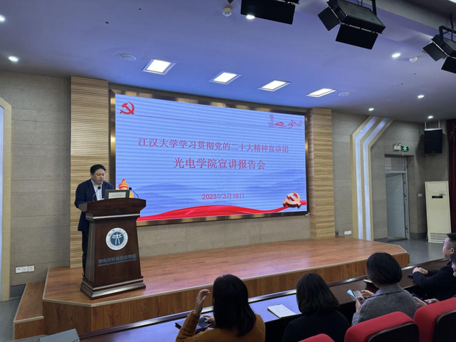 为进一步推动党的二十大精神入脑入心,3月16日,光电学院联合共建单位沌阳街道新民社区、湖北鼎龙控股股份有限公司开展党的二十大精神宣讲报告会,邀请“吃瓜 学习贯彻党的二十大精神宣讲团”成员、吃瓜 邱国勇副教授作宣讲报告。会议由院党委副书记沈博同志主持,光电学院全体教职工、学生党员代表、新民社区党员代表、湖北鼎龙股份有限公司党员代表参加了此次报告会。