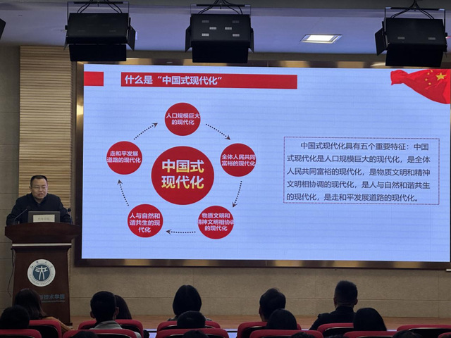 邱国勇副教授围绕“以中国式现代化推进中华民族伟大复兴”简要介绍了党的二十大报告,以中国近代史、党史为切入点,带领光电学院师生回顾了党的百年奋斗历程,为全院师生从多个角度阐释中国式现代化的中国特色和本质要求。他指出,推进中国式现代化建设是对我国社会主义现代化建设长期探索和实践的科学总结,是对世界现代化理论的重大丰富和发展,全面建设社会主义现代化国家,是一项伟大而艰巨的事业,前途光明,任重道远。