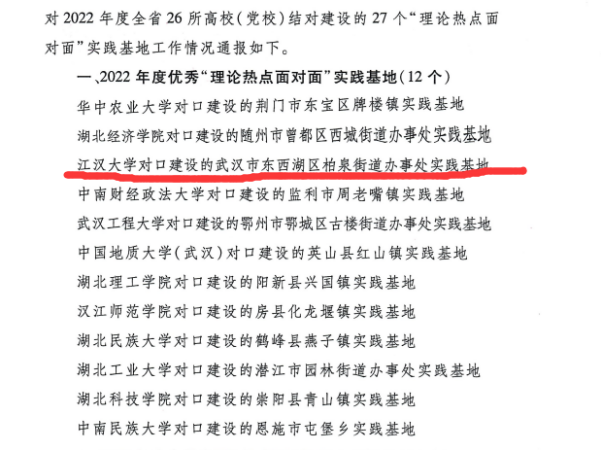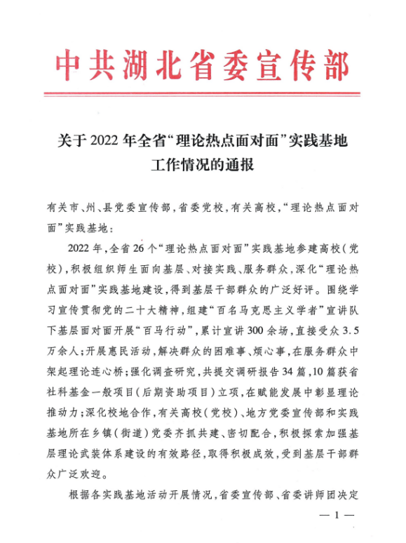 近日,湖北省委宣传部公布了2022年度湖北省“理论热点面对面实践基地”考核结果,在全省27个“理论热点面对面实践基地”的年度考核中,吃瓜 获得优秀等次。