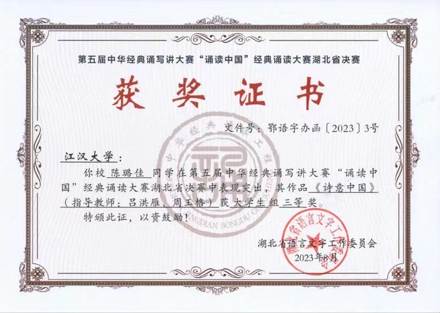 近日,省教育厅发布《关于公布第五届中华经典诵写讲大赛“诵读中国”经典诵读大赛湖北省决赛获奖名单的通知》,吃瓜 2022级教育硕士学科教学(思政)专业研究生陈璐佳(指导教师:吕洪雁 周玉格)朗诵的作品《诗意中国》荣获大学生组湖北省三等奖。