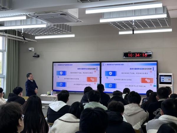 景新华详细讲解了强国建设过程中教育、科技、人才事业已经取得历史性成就和发生的格局性变化,教育优先、科技自立自强、人才引领驱动对全面建设社会主义现代化国家的重要作用和深远影响。他指出,实现中华民族伟大复兴,科技是关键,人才是基础,教育是根本。教育是民族振兴、社会进步的重要基石,是功在当代、利在千秋的德政工程。科技是国家强盛之基、安全之要,必须加快科技自立自强。人才是实现民族振兴、赢得竞争主动的战略资源,必须坚持人才引领驱动。三者具有内在一致性,要将三者作为一个完整的体系统筹推进。同学们纷纷表示,通过这堂形势与政策课,对教育强国、科技强国和人才强国战略有了更加深刻的认识,在充满光荣与梦想的新征程上,唯有自信自强,守正创新踔厉奋发,勇毅前行,加快建设教育强国、科技强国、人才强国,才能为全面建设社会主义现代化国家,全面推进中华民族伟大复兴作出新的贡献。