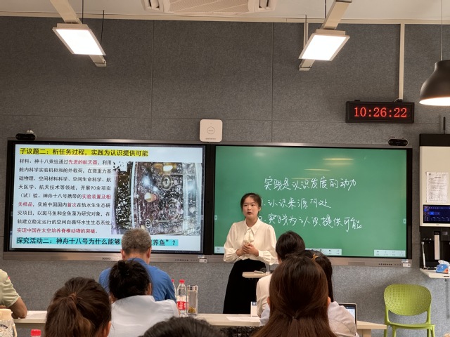 参赛选手们结合现行统编教材初中《道德与法治》、高中《思想政治》必修教材中自选相应内容,形成教学片段,进行10分钟教学展示;评委专家根据展示内容提问,选手现场作答,评委老师结合教学方法、教学内容、课堂板书、教学效果、仪表仪态等综合表现进行打分并现场公布成绩。