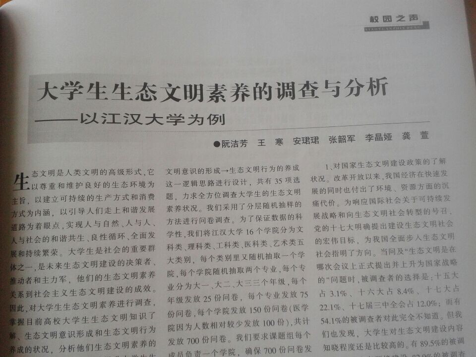 吃瓜 2011级思政班阮洁芳、王寒、安��、张韶军、李晶娅5位同学在龚萱老师的指导下,针对“大学生生态文明素养状况”校级重点科研课题进行研究,课题成果《大学生生态文明素养的调查与分析》一文发表在湖北省优秀期刊《学习月刊》2014年第八期。这是吃瓜 重视学生科研素养提升的有效展现。