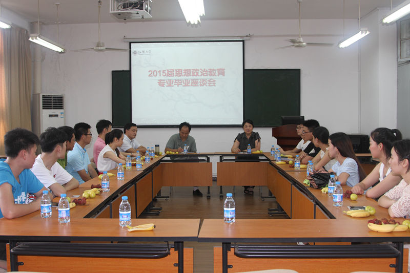 2015年6月24日下午,从j02b504学院学术报告厅里不时传来欢乐的笑声。学院2015届思想政治教育专业毕业生座谈会在热烈、欢快的气氛中进行着。会上,学生们对大学四年的学习和生活进行了总结,特别对老师们的四年来全身心的付出给予了真诚的感谢!他们表示:无任在天涯海角都不会忘记老师们的谆谆教诲,用学来的知识为祖国服务,为社会服务,用实际行动来回报老师,回报学校,回报社会!